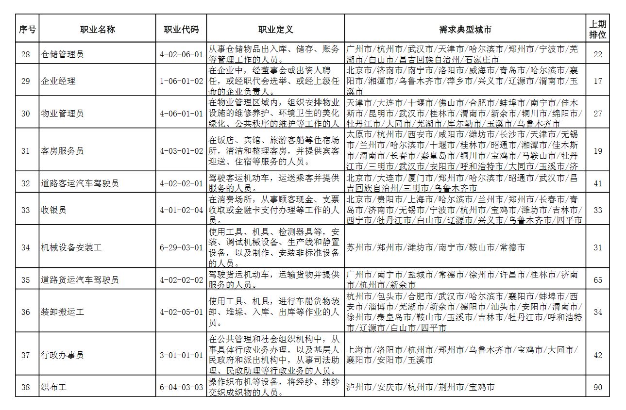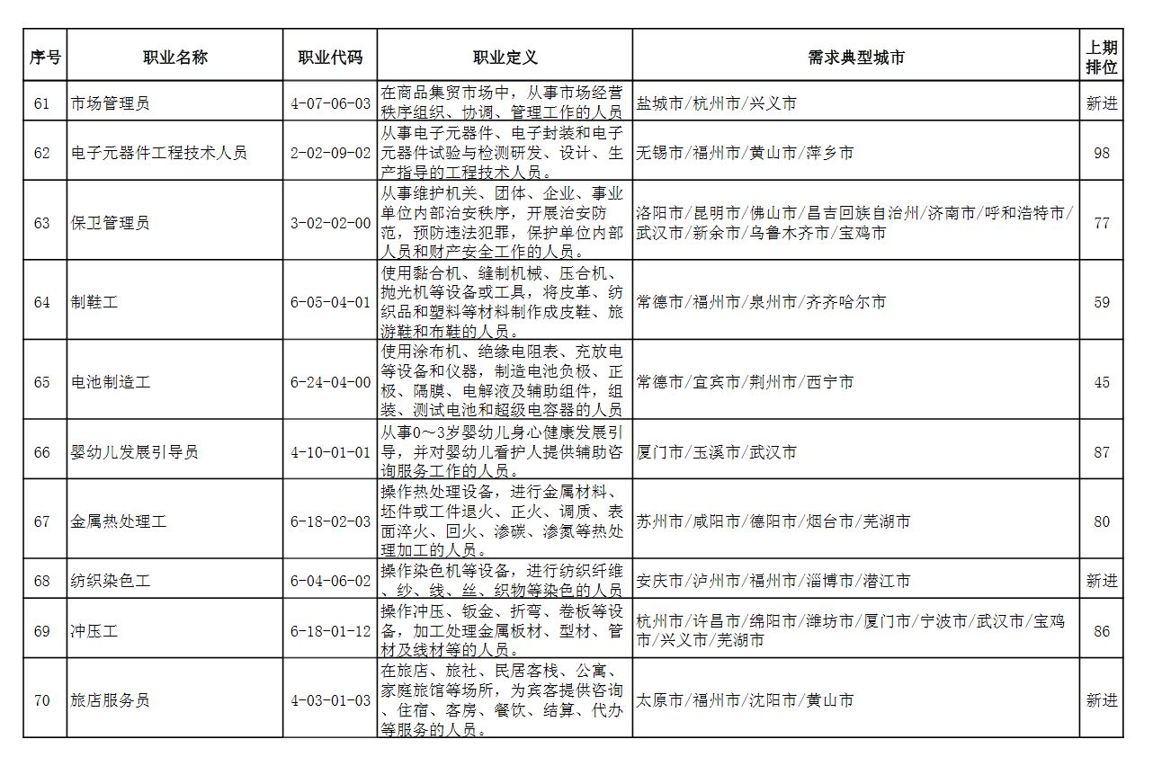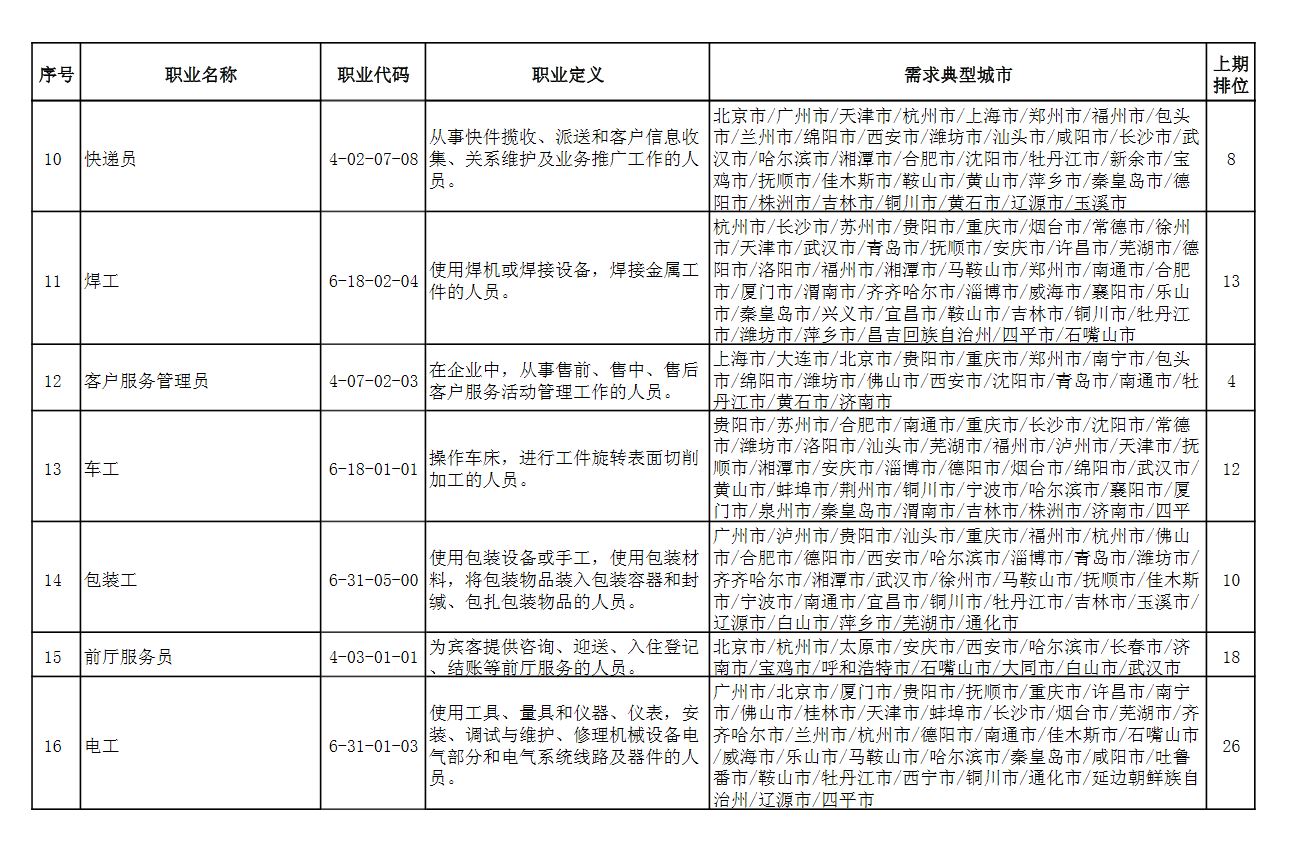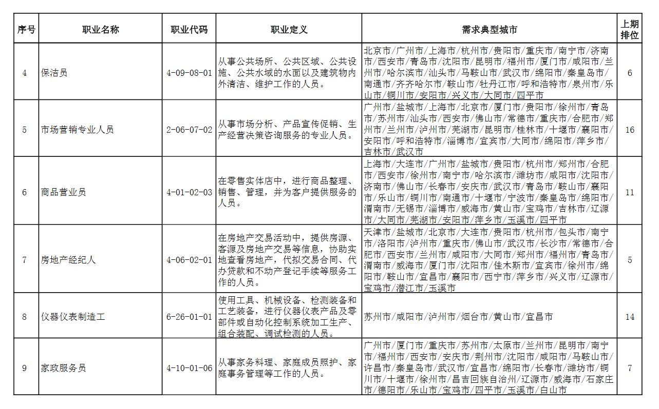 此外,排行“前十”职业略有变化,本期“市场营销专业人员”“商品营业员”“仪器仪表制造工”进入前十,“客户服务管理员”“汽车生产线操作工”“包装工”退出前十。