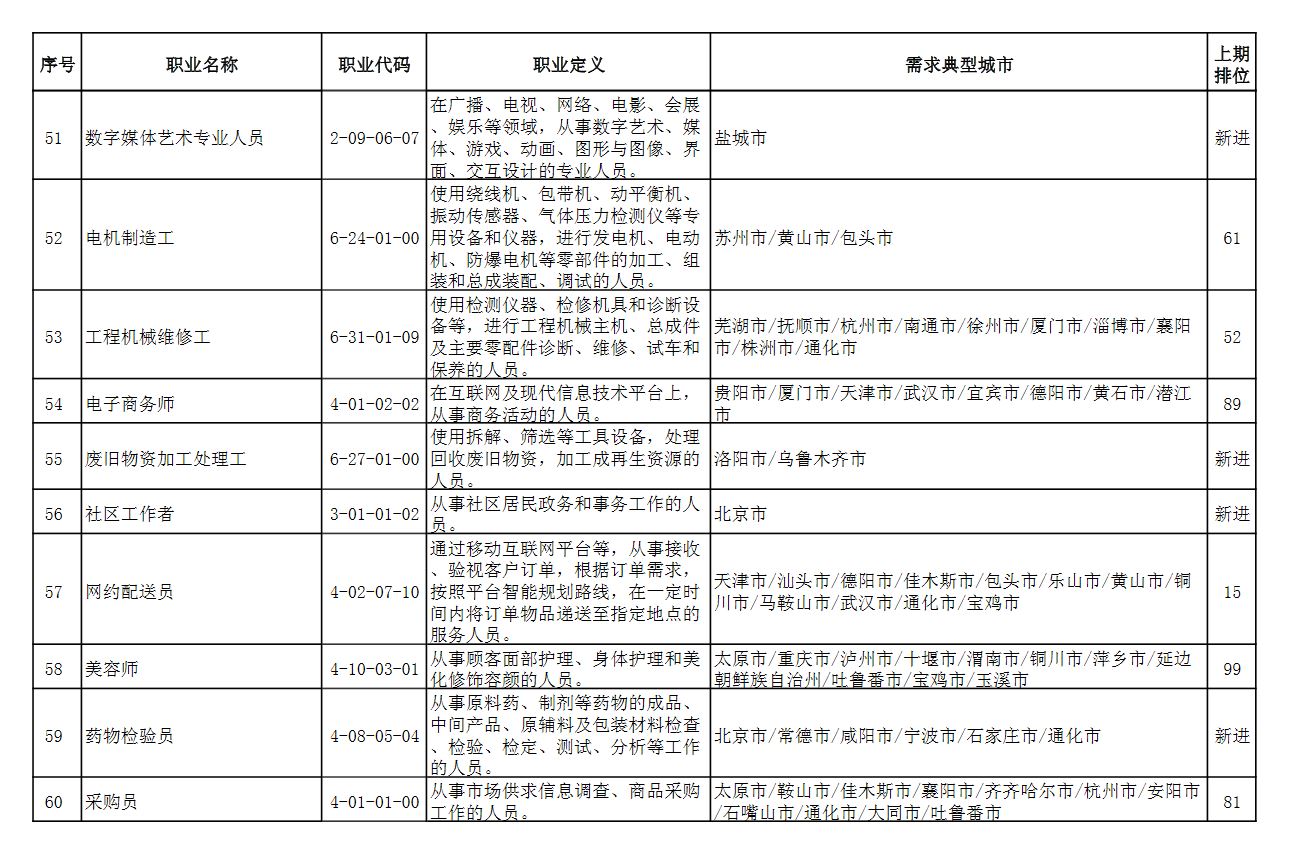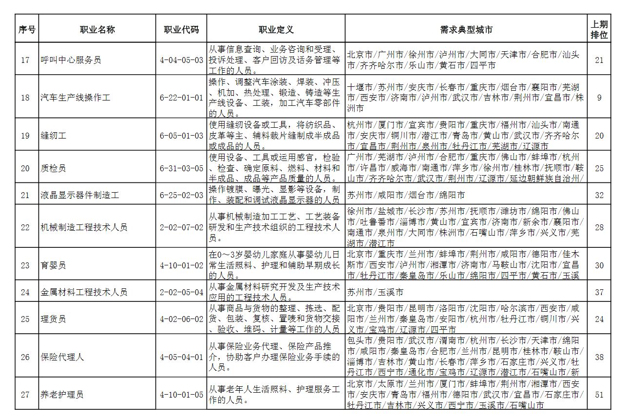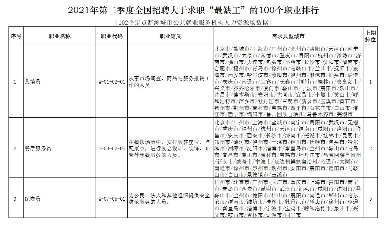 中国人社部22日发布2021年第二季度全国招聘大于求职“最缺工”的100个职业排行。