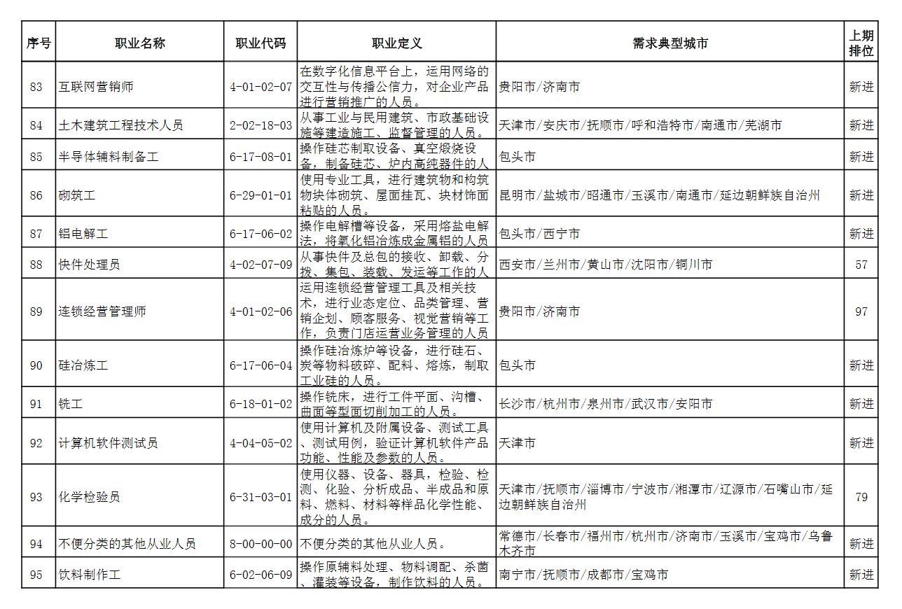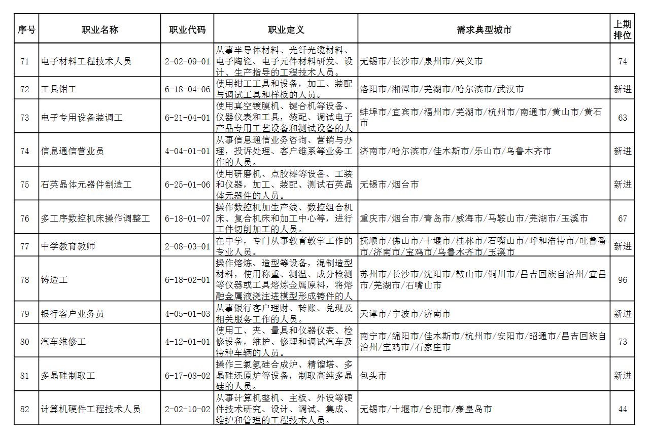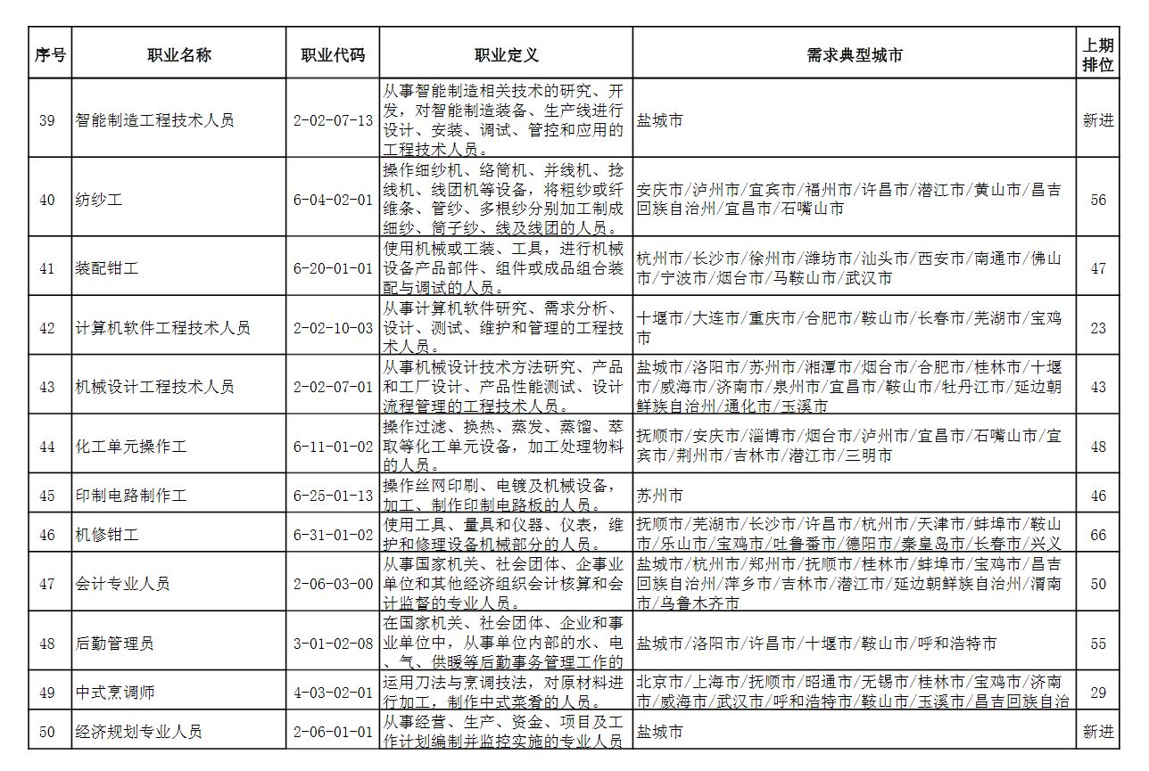 中国人社部22日发布2021年第二季度全国招聘大于求职“最缺工”的100个职业排行。