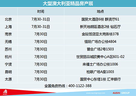 大型澳大利亚精品房产展北京:国贸大酒店6楼群贤厅61上海:新天地朗廷酒店2楼钻石厅南京(仅7月30日):金陵饭店亚太商务楼37B无锡(仅7月30日):恒隆广场办公楼4804苏州