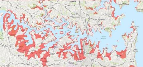地图显示了在海平面上10米以下、内陆1千米范围内、离河口10千米范围内的地区。红色地区也包括了很多悉尼海港景观区域,这些人都需要撤离到安全地带。