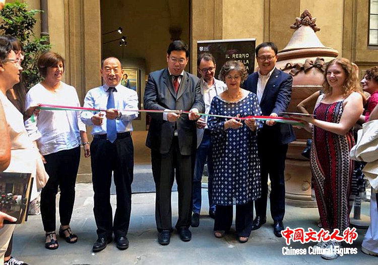 中国驻意大利佛罗伦萨领事馆总领事王文刚、意大利艺术研究院院长克丽丝蒂娜·阿齐蒂尼和画家韩玉臣为展览剪彩