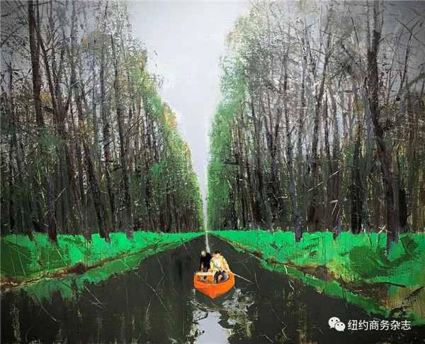 明华的风景画猛一看似乎有些"粗野",其实不然,画家的心思不乏缜密,若定睛细观会发现,汪洋恣肆的画面中时常留有一隅空旷与静寂,静寂处可以寻见一抹小舟,舟中立一小人。人极小,小到看不到五官和任何细节,他就那样立着,任小舟随意漂流。