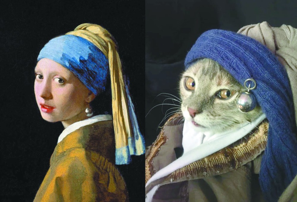 在众多被演绎的作品中,网友们作品的风格大致可以分为两类。第一种是“高仿”,这一类通常是人物肖像画。参与者利用自己的服装、首饰、宠物等,高度还原原作。其中被模仿最多的要数约翰内斯·维米尔的《戴珍珠耳环的女孩》。这幅画作的高仿品既有少女版,也有老妇版,甚至还有胡子拉碴的大老爷们版。由于还原度高,因此十分考验模仿者对细节的观察力、动手能力以及创造力,不少仿作让人十分惊艳。还有达·芬奇的《抱银貂的女子》也是被高仿频率颇高的作品。不过由于银貂不是人人都有,家里的猫、狗,甚至毛绒玩具便被用来当道具,幽默感十足。