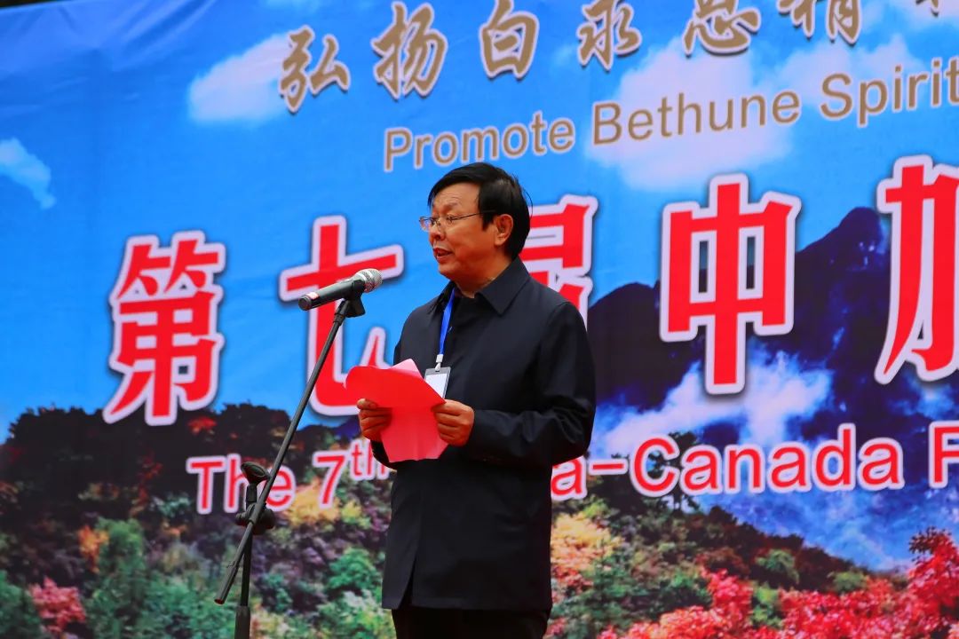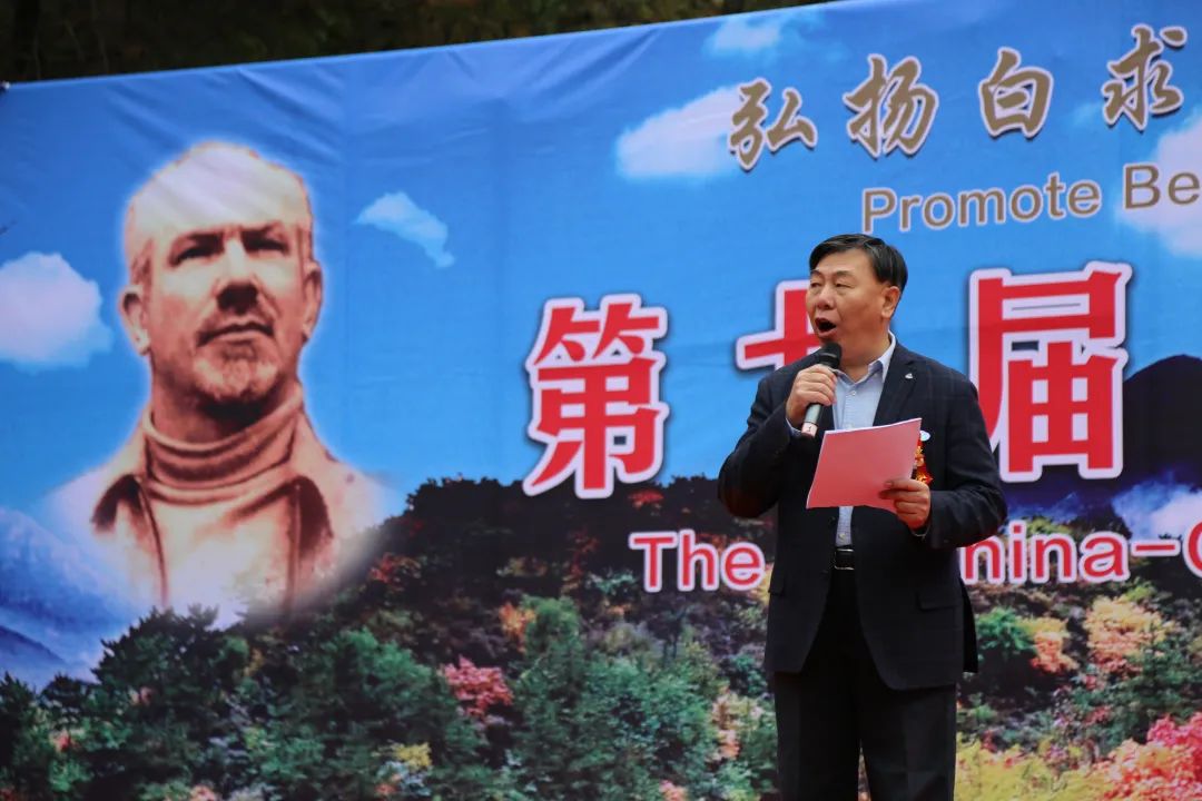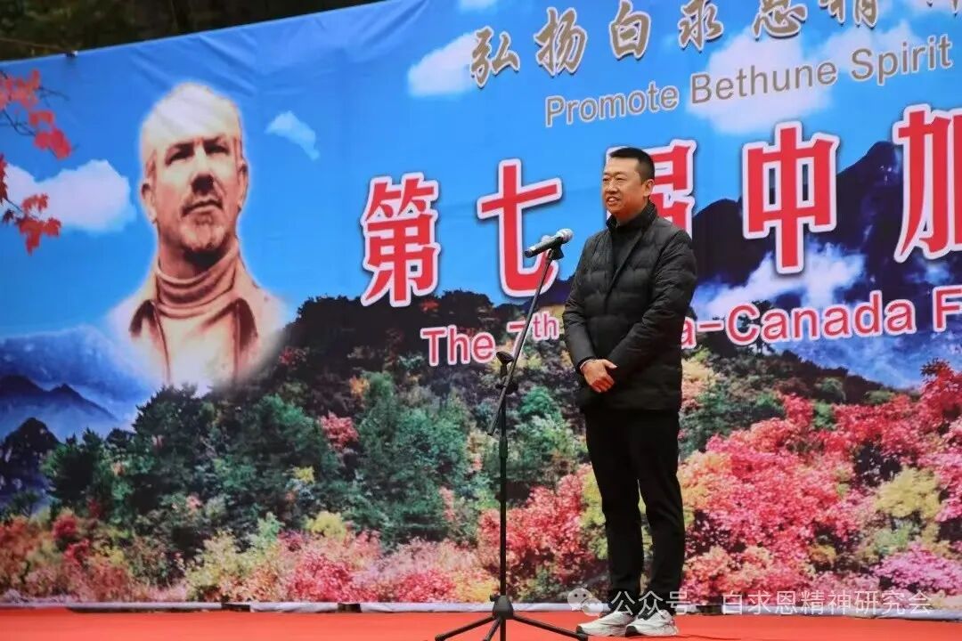中国白求恩精神研究会执行会长陈天平首先代表主办方讲话。他指出:自2018年以来,“白银坨中加友谊枫叶节”已成功举办了六届。每一届尽管形式各异,内容不同,但主题始终如一,那就是以枫叶为媒,让海内外更多的人走进白银坨,走近白求恩,加强交流,增进友谊。自枫叶节举办以来,得到了中加政府和民间有识之士的高度赏识和青睐,关注度和参与度越来越高,特别是在白求恩的故乡,影响力和知名度也越来越大,来自加拿大政府、大使馆、加中友协的相关人员曾多次出席活动,加拿大总理特鲁多还曾专门发来贺信。可以说,“白银坨中加友谊枫叶节”已成为加强中加交流与了解的窗口,增进信任与合作的平台,深化两国人民友谊的见证和打造红色旅游国际化品牌的重要举措。