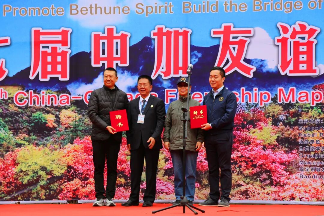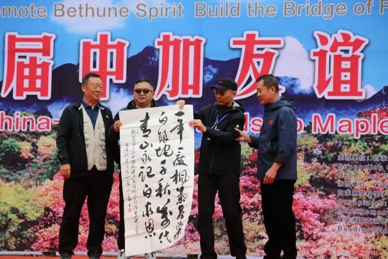 中国白求恩精神研究会原常务副会长兼秘书长蔡国军(右二)向活动承办方转赠了中国白求恩精神研究会老会长袁永林将军为本届枫叶节题写的书法贺词:一年一度枫叶尽染白银坨,千秋万代青山永记白求恩