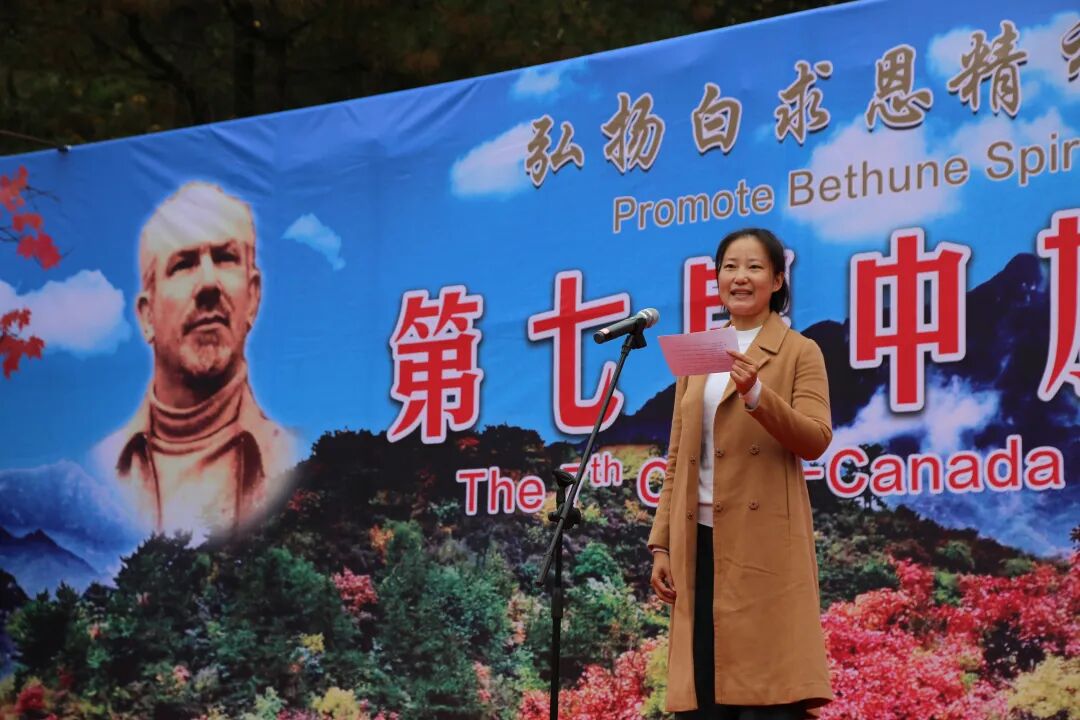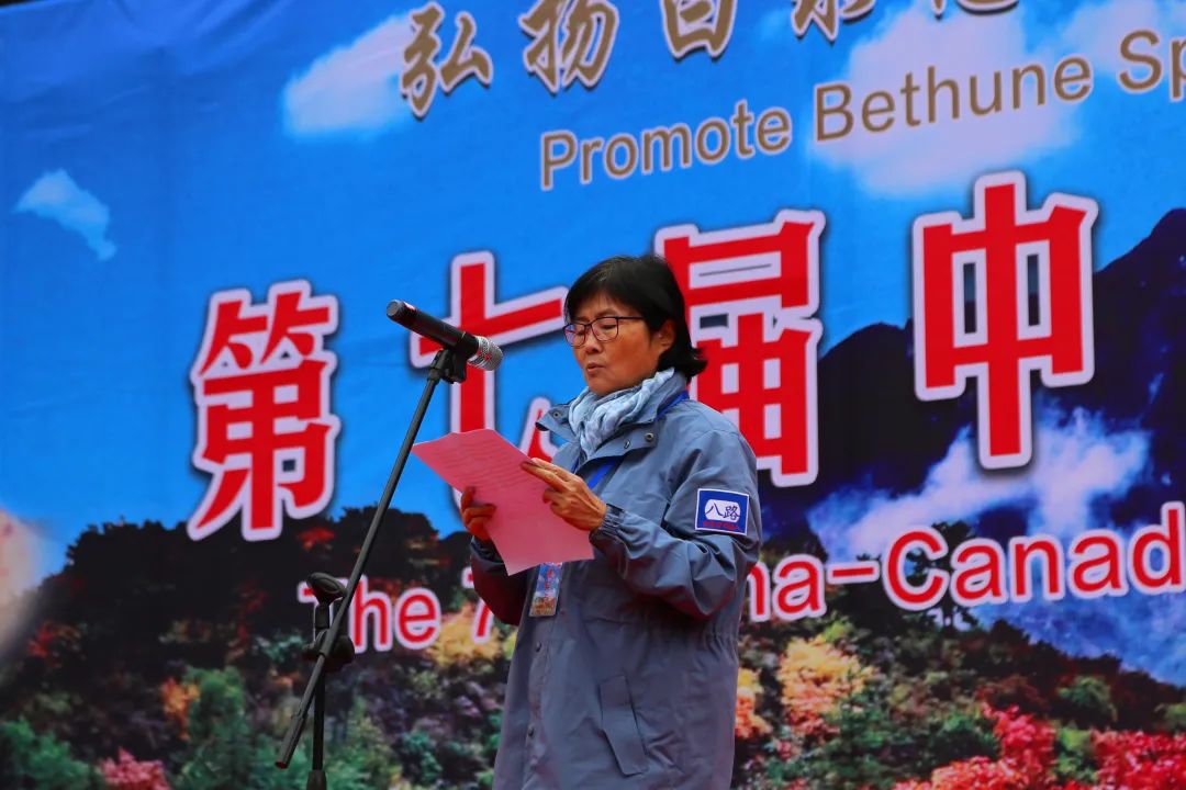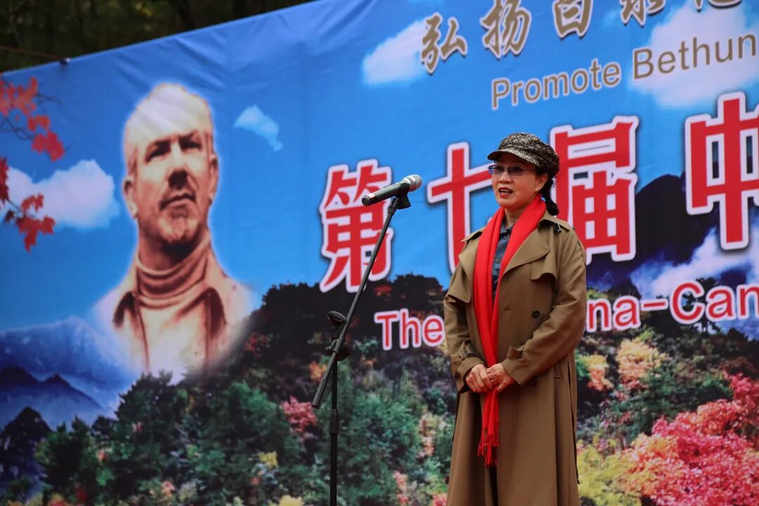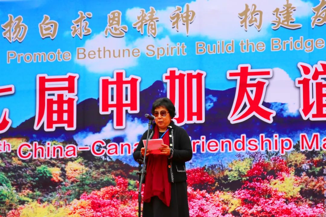 加拿大当代白求恩行动促进委员会会长马楠接着讲话,她深情回顾了白求恩大夫援华期间的光辉事迹,介绍了加拿大当代白求恩行动促进委员会成立以来开展活动的情况,最后表示要继续为推动广泛开展学习白求恩活动和增进中加友谊做贡献。