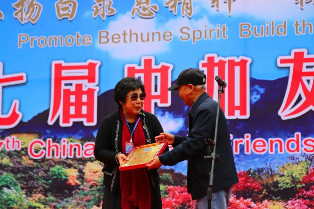中国白求恩精神研究会原名誉会长栗龙池代表中国白求恩精神研究会向马楠会长颁发了“弘扬白求恩精神特别贡献奖”。