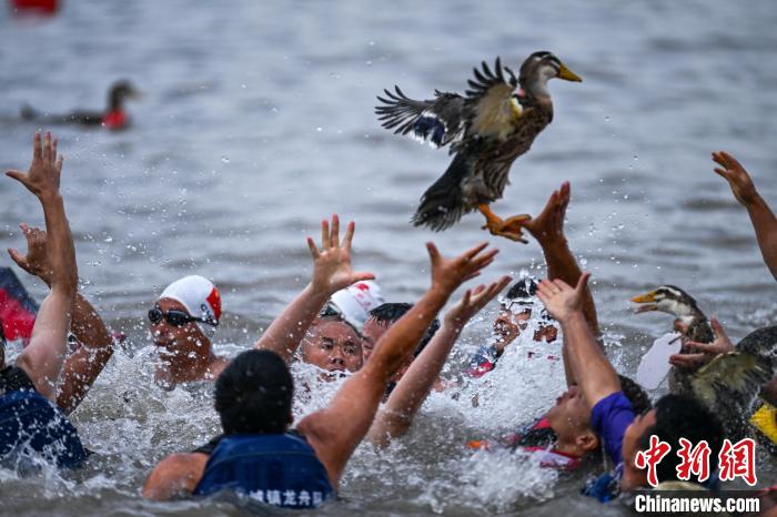 5月28日,四川夹江,游泳高手在青衣江上抢鸭子。当日,2025年全国龙舟大联动暨“划遍四川”乐山夹江站比赛拉开序幕,来自全国各地的24支龙舟代表队在青衣江上飞桨逐浪、龙舟竞渡迎端午。中新社记者 刘忠俊 摄
