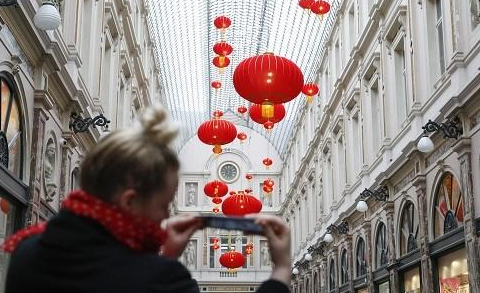 资料图片:2月15日,在比利时首都布鲁塞尔,一名游客在圣于贝尔购物长廊拍摄中国红灯笼。新华社记者叶平凡摄中国大陆游客出境消费额占全球