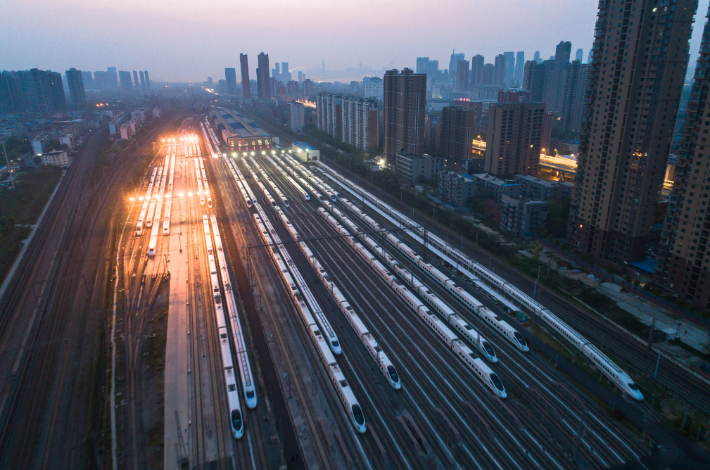 4月8日,武汉市正式解除离汉离鄂通道管控措施,几十组在武汉动车段经过检修消杀的动车组,犹如“陆地舰队”停靠在存车线上,蓄势待发,重新启程。4月8日,在武汉动车段