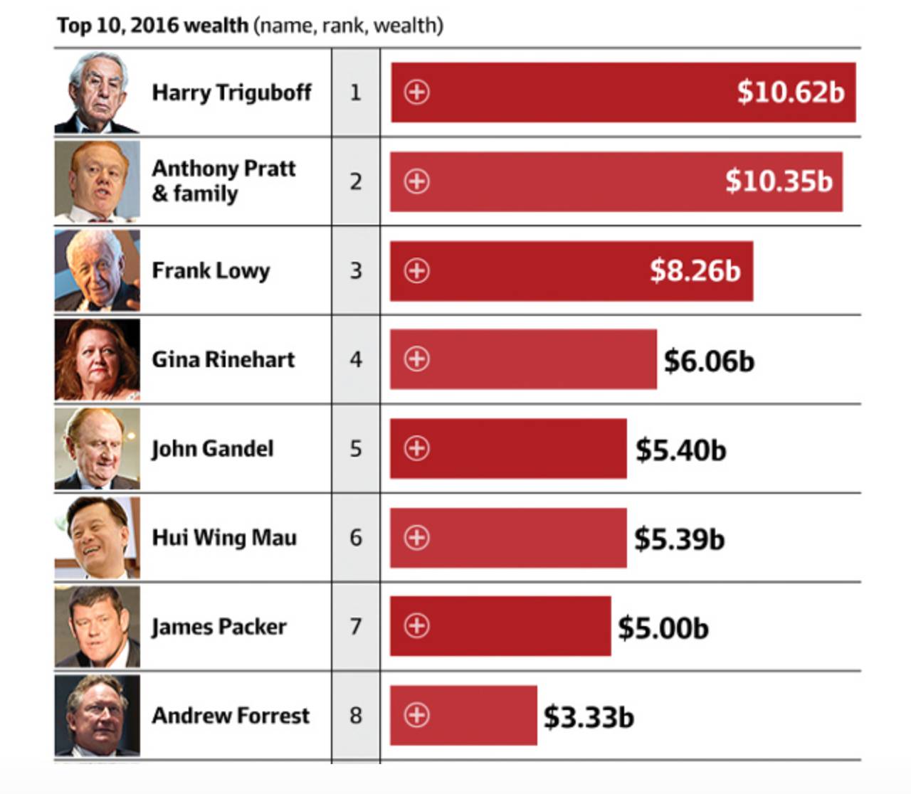 2016年BRW澳洲200富豪榜公布,在前十大富豪里有2位华人及其配偶,房地产大亨、美利通(Meriton)的老板特里古波夫(Harry Triguboff)首次登顶,过去5年都排名第一的矿业女富豪莱因哈特(Gina Rinehart)则跌到了第4位 。 据澳洲广播公司报道,绰号“高楼哈利”(High-rise Harry)的财富达到了106.2亿元。而在今年的200大富豪榜上,房地产界的大亨也分外耀眼,有54人的财富都主要来自于房地产业,其他的富豪也有不少人投资于房地产开发或管理。 不过今年的富豪榜也反映出了矿业潮终结的现状。莱因哈特的资产从去年的140.2亿元降到了60.6亿元,排名也从第一跌至第4。不过她的女儿比安卡(Bianca Rinehart)则以9.05亿元排名第60位。 FMG集团创办人弗利斯特(Andrew Forrest)也因矿业潮的衰落而受到重创。他的财富为33亿元,今年排在第8位。 华裔房地产大亨、香港世茂集团董事长许荣茂以53.9亿元的资产在富豪榜上排在第6位,也是澳籍华人中的首富。他去年则以68.9亿元的身家排在第5位。 电讯公司TPG的创办人、马来西亚华裔张氏夫妇David Teoh和Vicky Teoh去年名列13/14位,今年则跃升到了10/11位。他们的财富也从23.1亿元增加到30.8亿元。 资产增加最多的则是房地产开发商甘德尔(John Gandel),一年之中增加了10亿元至54亿元,排名也从去年第8升至了第5。 在今年的排行榜上,身家超过10亿元的有53人,占了200大富豪的26.5%,人数也创下了记录。 澳洲200大富豪的资产总额为1,973亿元,较去年增加了2%。 “明星级”富豪小派克(James Packer)在富豪榜上的排名虽然和去年一样都是第7,因为其博彩王国皇冠集团(Crown Resorts)的股价下跌,使得他损失了逾10亿元,身家从60.8亿元跌到了50亿元。 BRW 200大富豪榜1984年首次推出,对澳洲最富裕的200个家庭及个人的净资产进行评估及排名。