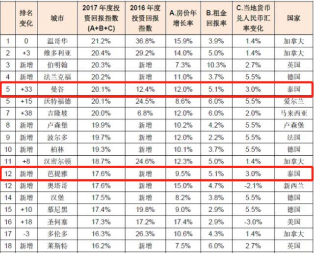 人民日报也发文指出,如果说之前各界对于“要不要征收房地产税”还有争议的话,那么目前无疑是释放了鲜明的信号——征收房地产税,已经是确凿无疑的方向! 2 数据显示,国内房产看跌 中国社科院3月2日发布的《中国住房市场发展月度分析报告》显示,2016-2017年,北京、上海等一线城市出台了有史以来最严格的市场调控政策。2018年它们仍将“坚持调控目标不动摇、力度不放松”。预计未来房价仍将延续当前跌势,难以出现有力反弹。 另一方面,二三四线城市潜在供给能力较高、已售空置现象较严重的市场特性,将抑制房价短期的进一步上涨。预计前期房价快速上涨的房价涨速将延续下降态势,部分城市房价将出现下跌。 放眼市场,哪里的房产值得投资? 胡润研究院5日发布的《2017年度胡润海外置业投资回报指数》榜单显示,前50名投资回报率最高的城市中美国以11个城市居首,中国仅有香港1个城市上榜。泰国、日本、澳洲等近期最受投资者追捧的热门国家均榜上有名。 2017年,泰国的房产投资市场瞬间火爆起来,从房价的增幅到可观的租金收入,曼谷的投资回报竟然达到20.1%,芭提雅达到17.6%,曼谷更是成功挤进全球前五,也成为很多投资人的首选国家。 2018年,泰国被彭博社评为“全世界最幸福的国家”。价廉物美的消费水平、全球最大的医疗旅游目的地、温暖宜人的生活环境……