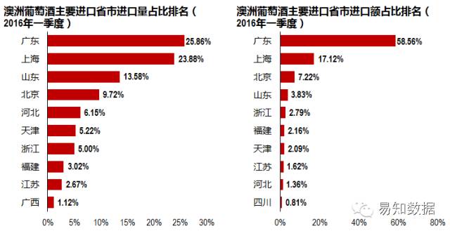 分省市来看,一季度对澳洲葡萄酒进口的主要省市中广东和上海分别位居第一位和第二位。从进口量占比来看,广东和上海份额均超20%,且仅有约2%的微小差距;而从进口额占比看,广东省以58.6%的份额占据绝对的主导地位,第二位的上海仅为17.1%。这也就意味着,广东省的葡萄酒进口均价要明显高于上海。数据显示,一季度广东省澳洲酒进口均价为16.2美元/升,上海为5.1美元/升,仅为广东的约三分之一。
