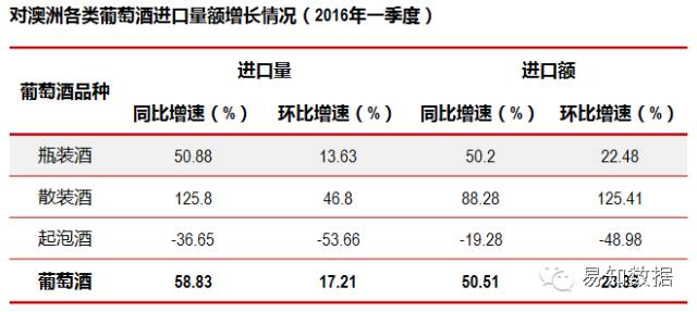 分品类来看,对澳洲葡萄酒进口的增长,散装酒成为主要的驱动力。数据显示,2016年一季度,散装酒进口量同比增长125.8%,进口额同比增长88.3%,成为拉高整体增速的主力。瓶装酒的增长情况一般,而起泡酒进口量额均为负增长,拖了澳洲酒进口增长的后腿。
