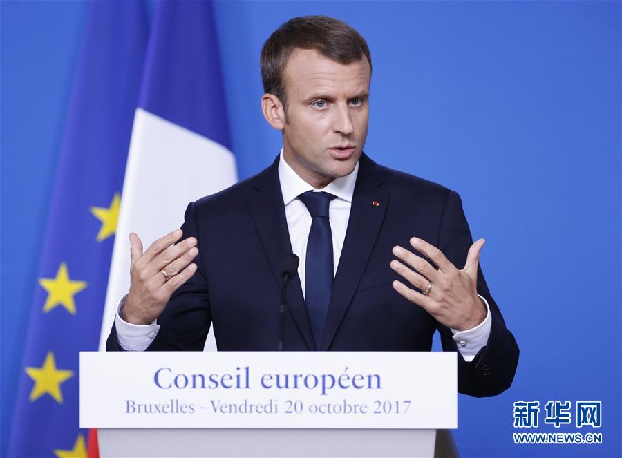10月20日,在位于比利时布鲁塞尔的欧盟总部,法国总统马克龙出席新闻发布会。欧盟27国领导人20日在布鲁塞尔宣布,将在欧盟理事会(除英国)以及谈判团队内部启动“脱欧”第二阶段谈判的准备讨论工作。新华社记者叶平凡 摄
