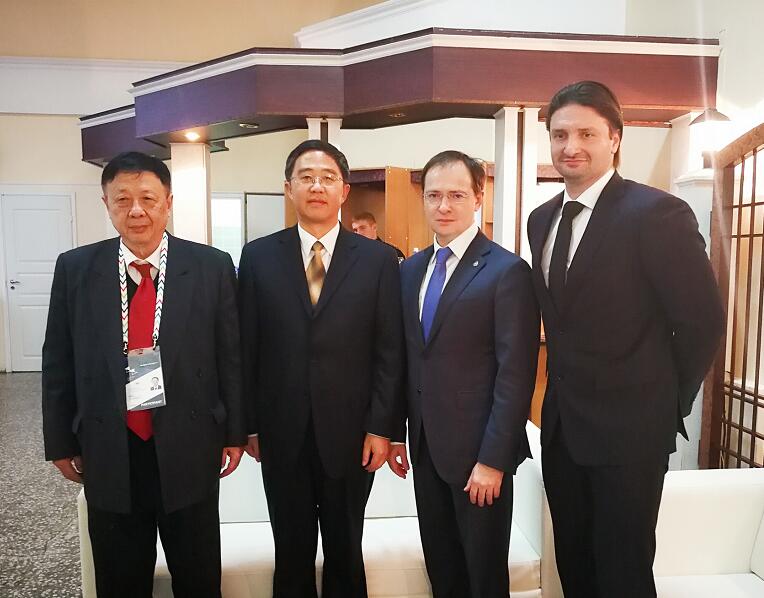 俄罗斯联邦文化部部长弗拉基米尔·梅津斯基(右二)接见张家界常务副市长罗智斌(左二),项目合作方张家界大成山水酒店董事长毛致平(左一)、