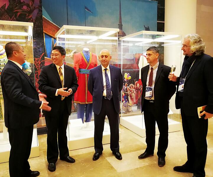 俄罗斯联邦文化部部长弗拉基米尔·梅津斯基(右)接见张家界常务副市长罗智斌(中),