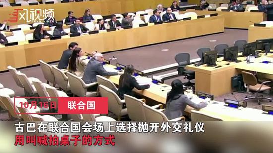 10月16日,在位于纽约的联合国总部,一名古巴代表(前排中)在会议上呼喊口号。新华社记者李木子摄