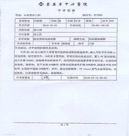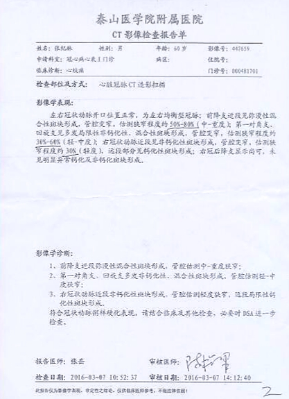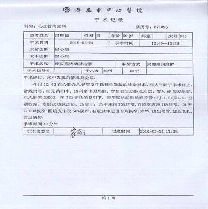 (患者张纪林治疗前心脏造影单,已堵塞百分之一百)
