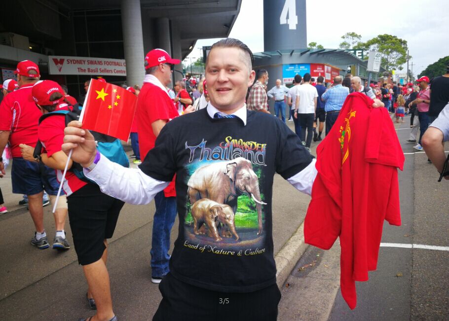 在和林女士交谈的时候,记者看到一名板球场工作人员前来向欢迎队伍索要中国国旗和文化衫,并且饶有兴致地挥舞着小国旗。这名工作人员叫夏普(Adam Sharp),是悉尼天鹅队(Swans)的粉丝