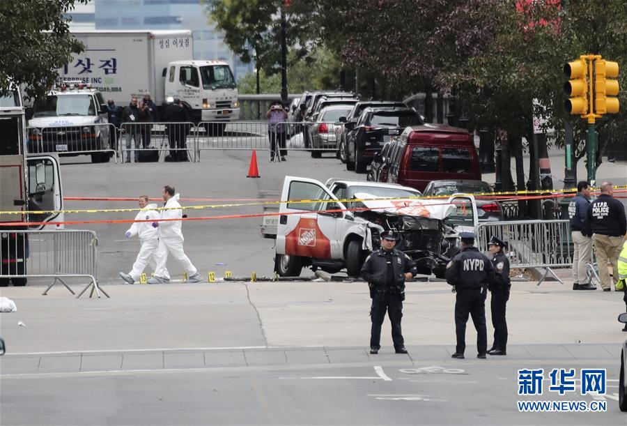 11月1日,在美国纽约曼哈顿下城,调查人员从肇事的小型卡车旁走过。当日,针对纽约曼哈顿下城小型卡车撞人恐怖袭击事件的调查仍在继续。美国纽约市曼哈顿下城10月31
