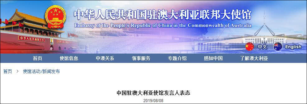 中国驻澳大利亚大使馆网站8月8日发布使馆发言人表态,对澳大利亚联邦众议员海斯蒂鼓吹中国威胁论表示坚决反对。敦促澳有关政客摘掉有色眼镜,客观理性看待中国的发