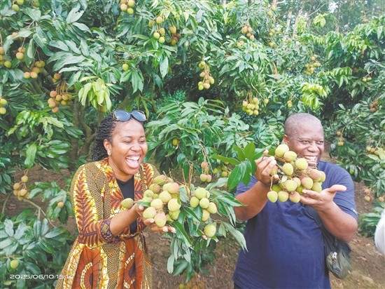 果园现场,泛红的荔枝挂满枝头,由于营养丰富、色泽艳丽,她一边采摘,一边拍视频发给加纳的亲友,向他们介绍中国这款特别的水果。