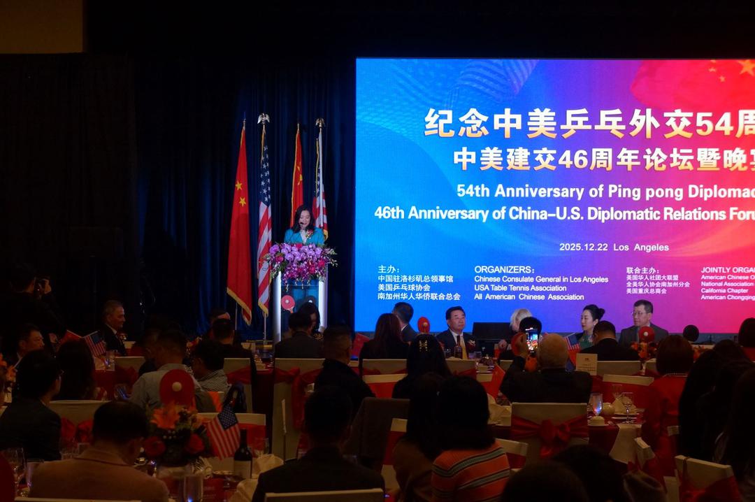 (洛杉矶,2025年12月23日李燕)—枚轻盈的银球,曾转动地球;如今,它在—代又—代青年手中,传递着不变的友谊。当地时间12月22日,在纪念中美“乒乓外交”54周年论坛暨晚宴上,最动人的焦点不是沉重的历史回顾,而是洋溢在球台周围的青春笑脸与真挚对话。这场由中国驻洛杉矶总领事馆、美国乒乓球协会及美国南加州华人华侨联合总会主办的活动明确宣告:中美关系的未来,正由青年携手书写。