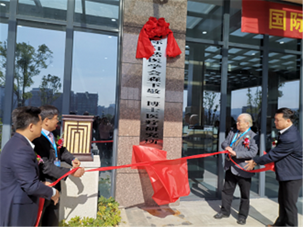 森下敬一、王智墨、梅州市爱卫会副主任黄伟华、大埔县委书记汉东共同为国际自然医学会森下敬一博士医疗研究所揭牌。