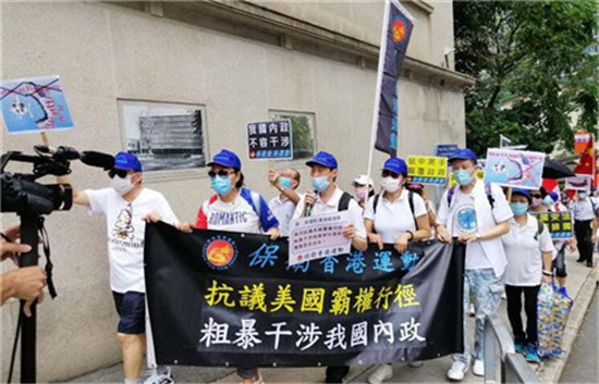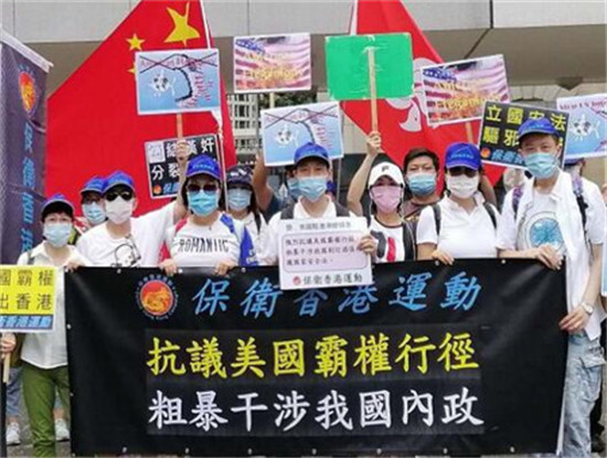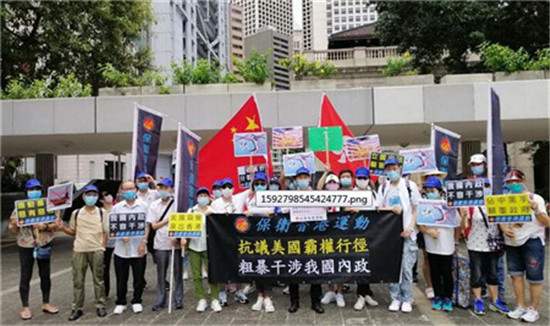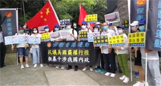 团体一行20人高叫「美国霸权 滚出香港」、「我国内政 不容干涉」等口号,并手持中国国旗,由中环遮打花园游行至美国驻港总领事馆前。