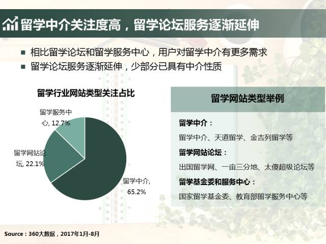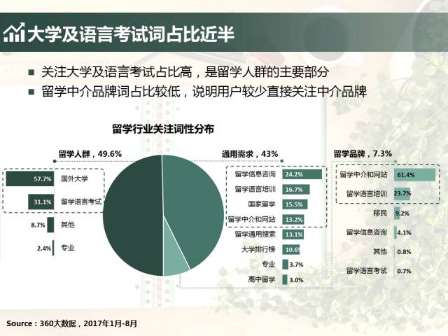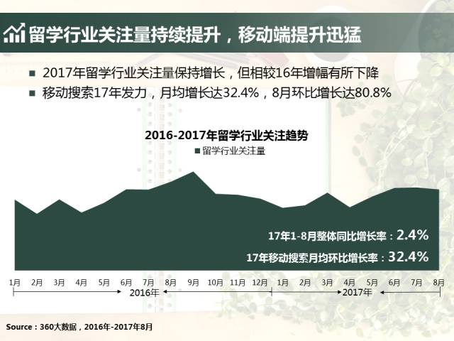 2017年8月末,《时代周报》一篇关于海外留学的报道《失落的海归:留学花费超过100万月薪不到6000元》引发了家长和学生的热议。 但是,当海归的优势不再如往年那么明显后,人们对留学的关注却并没有随之降低,反而,游学作为留学简化形式增长显著。 2017年留学行业态势如何?关注趋势向什么方向发展?如何洞察留学行业人群?《2017年留学行业大数据报告》为你揭秘。