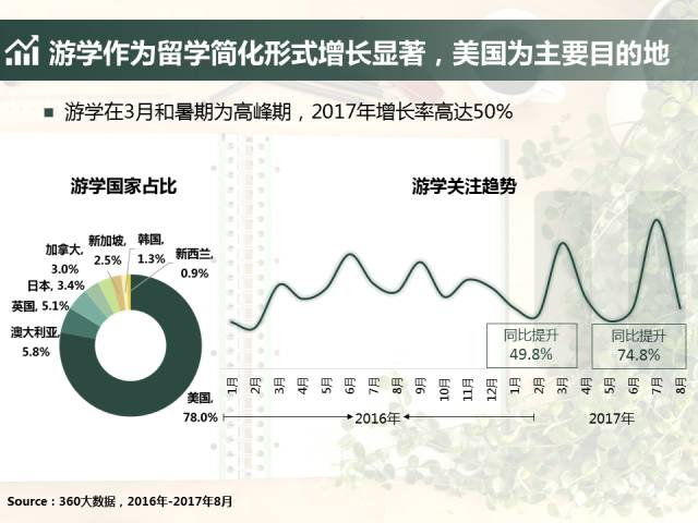 但是,当海归的优势不再如往年那么明显后,人们对留学的关注却并没有随之降低,反而,游学作为留学简化形式增长显著。