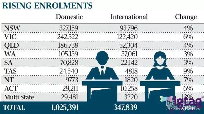 2014年,国际学生比例跃升最快的是塔州,实现了9%的增长。而该年学生人数最多的则是维州,共有12万2420名留学生注册。总体而言,共有34万7839名海外学生在澳洲学习。