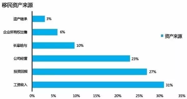 资产来源主要还是自己的积累,工资收入、投资回报、公司经营是他们最主要的财富来源。而来自于上一代的财富积累却占少数。其中,工资收入占31%;投资回报占27%;公司经营占23%。在移民资产来源中以商业性回报占主要地位。
