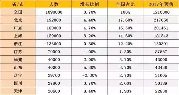 中国千万富豪人数达到109万,相比2014年增长了3.7%。其中北京有19.2万的千万富豪,全国占比17.6%,位列第一。广东和上海分别以18万和15.9万分列第二位和第三位。预计在3年后的2017年,全国千万富豪的人数将增长至121万人。