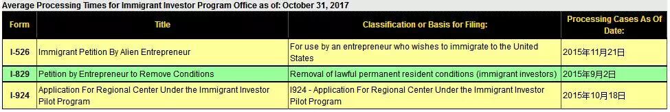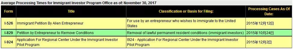 I-526申请,审案截止日为2015年12月12日 I-829申请,审案截止日为2015年10月24日 I-924申请,审案截止日为2015年12月2日 ▲2017年11月审案进度截图(点击看大图)