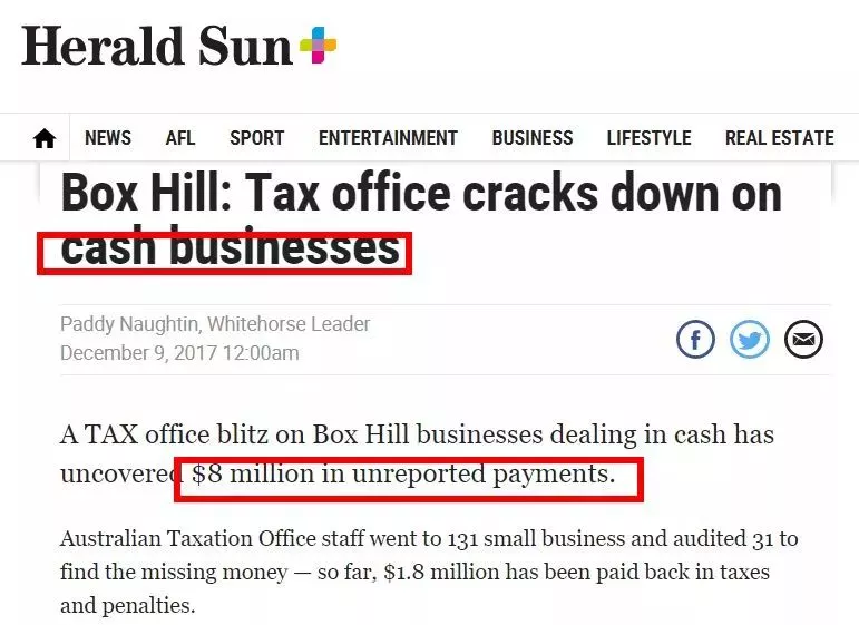 而且,由于众(爱)所(用)周(现)知(金)的(不)原(报)因(税),不少华人企业早就被ATO盯上了!遭遇了一次又一次的扫荡!这不,一个月前,ATO刚刚横扫过墨尔本华人区Box Hill,对那些爱用现金的商户进行了严打!查出了共计$8,000,000的各种未报税金额!