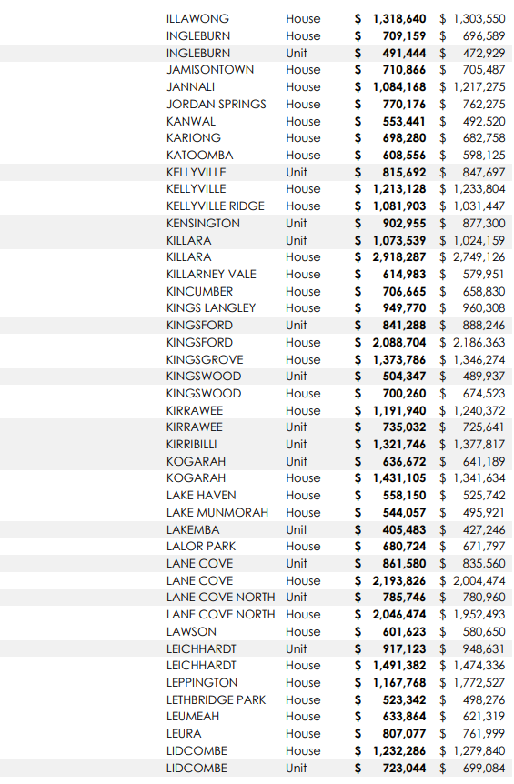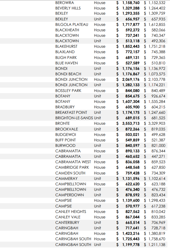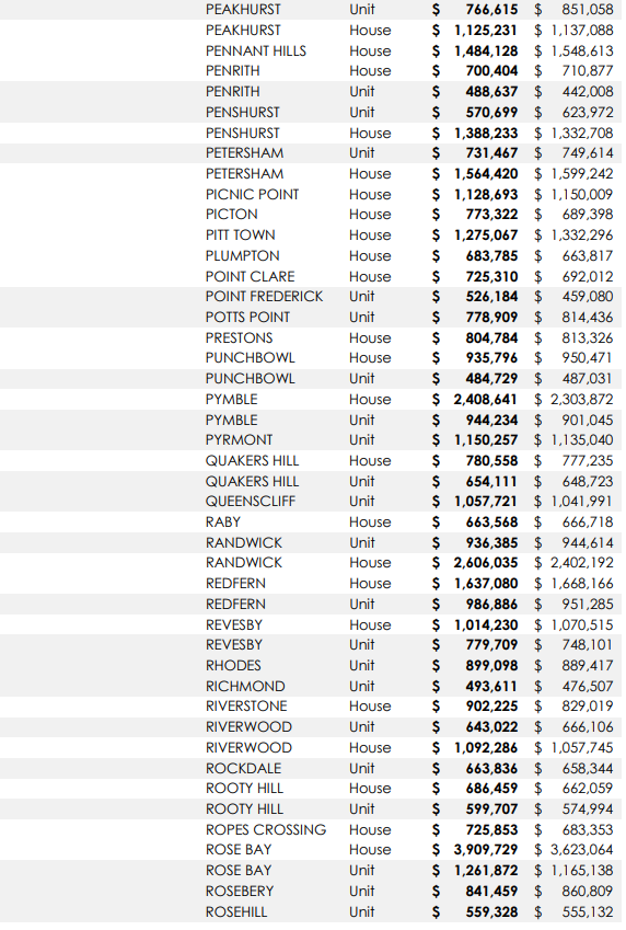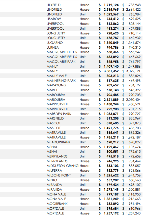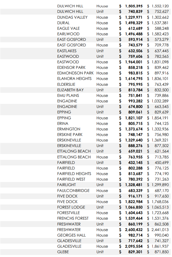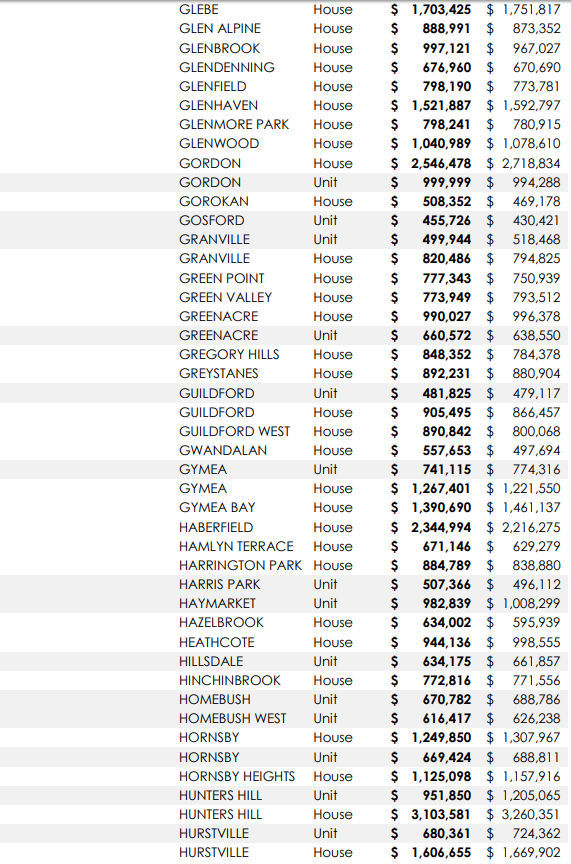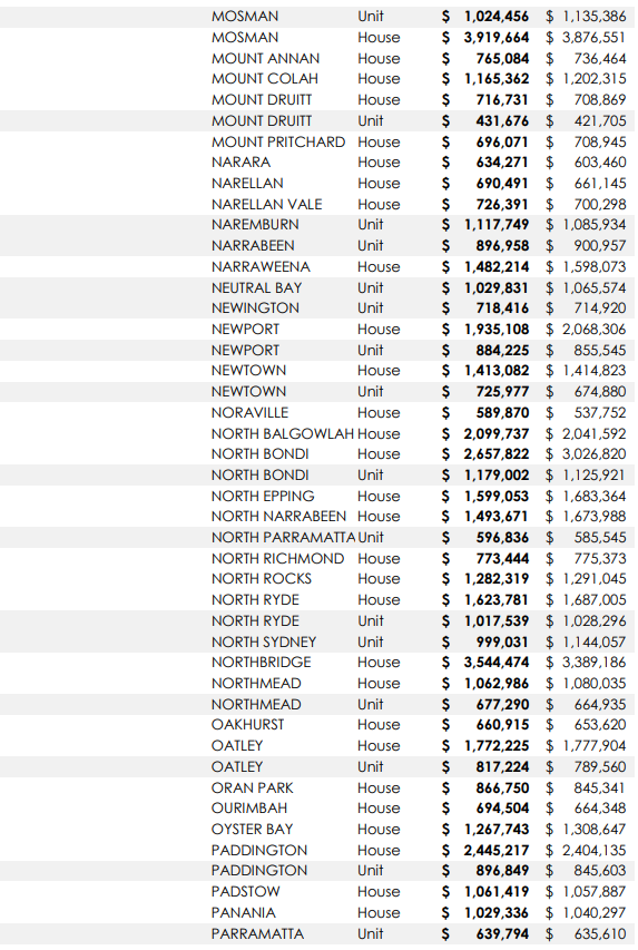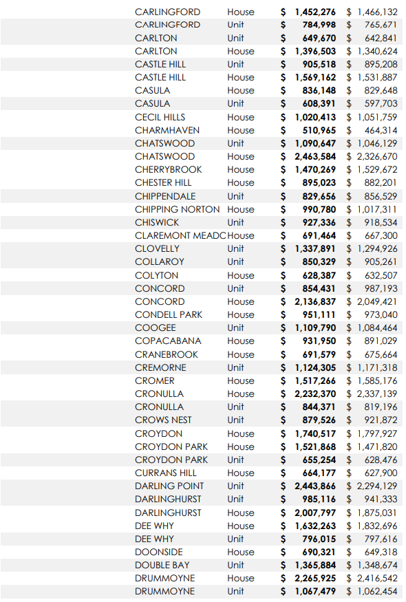 悉尼313个城区独立屋及公寓中位价一年涨跌情况