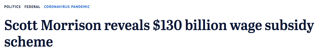 澳洲政府将实施1300亿澳元的工资补贴计划,为600多万名澳洲人人提供工资支持!在接下来的六个月里,预计每位企业员工可得到每两周最多1500澳元的政府补贴。这笔钱将支付给雇主,随后以工资的形式发放。