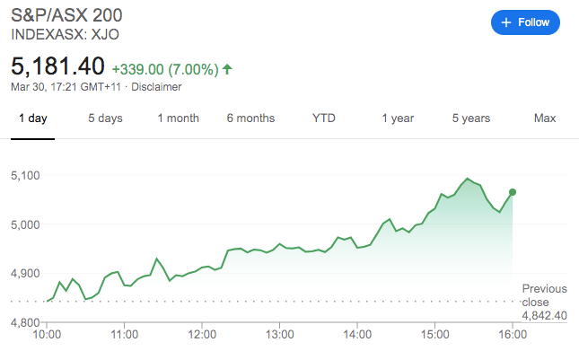 在宣布了工资补贴计划后,澳洲的股市也应声上涨!涨幅达到7%!这是40年来单日的最大涨幅。