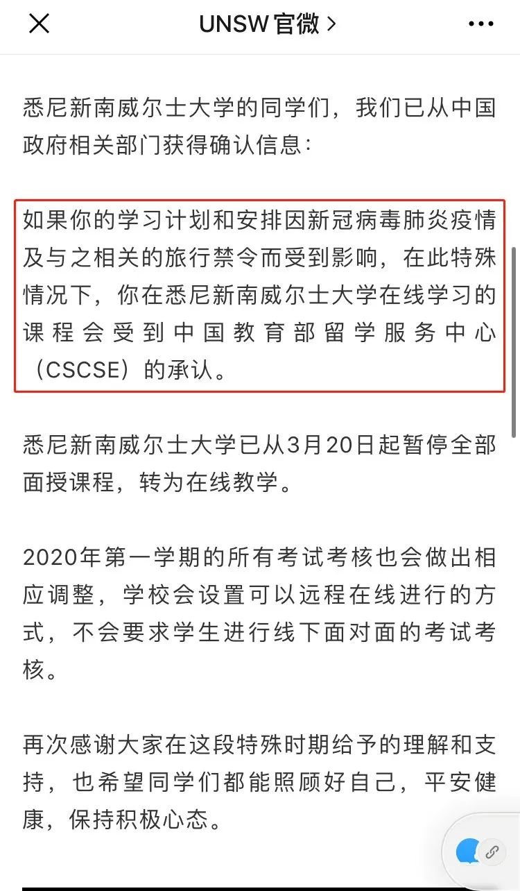 其他学校虽然还没官方公布,但同学们不用太担心,澳洲大学很早就和中国教育部达成一致了。中国教育部留学服务中心之前就已经确认,只要在受疫情影响的情况下,教育部就会认可学生的在线学习。