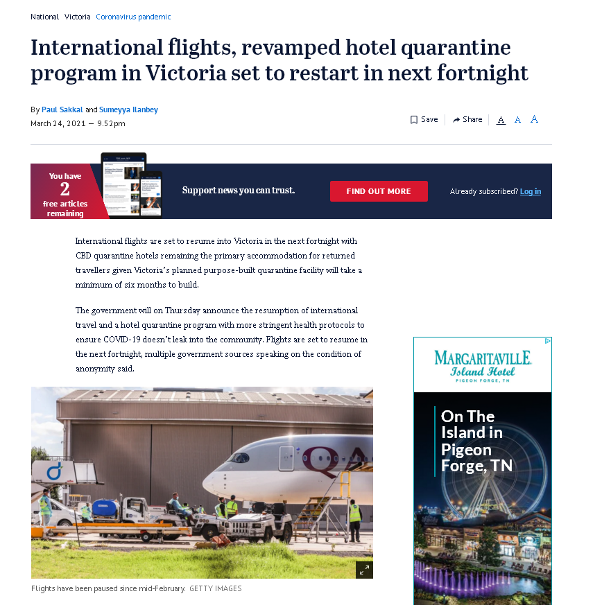 《时代报》报道,据悉,自今年2月14日墨尔本假日酒店(Holiday Inn)聚集性疫情暴发后,抵达墨尔本的国际航班被暂停。