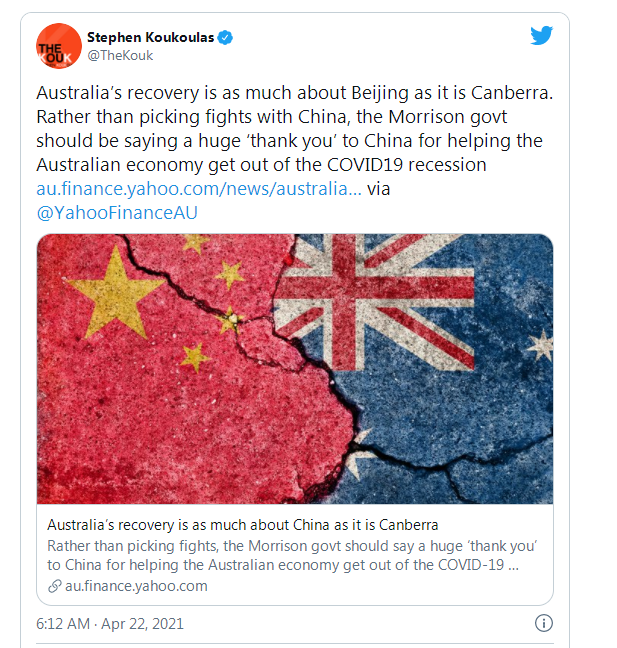市场经济(Market Economics)董事总经理、花旗银行(Citibank)前首席经济学家库库拉斯(Stephen Koukoulas)近日发文称澳洲的经济复苏离不开中国强劲的经济。