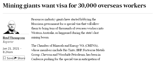 对此,CMEWA首席执行官埃弗林厄姆(Paul Everingham)回应说,西澳和澳洲其他地方不能提供所需要的工人。西澳拥有价值约1400亿澳元的资源项目,也早已处于工人短缺的边缘。这促使州长麦高文(Mark McGowan)将于6月30日召开危机会议,关键行业人士将参与。
