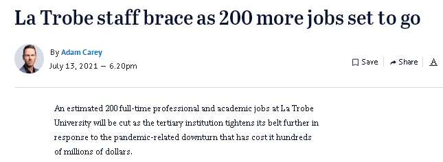 为了应对新型冠冠状病毒疫情带来的经济衰退,高等教育机构一直在缩减开支。墨尔本的拉筹伯大学(La Trobe University)已经因此损失了数亿澳元,据估计,他们决定削减200个全职专业岗位和学术岗位,以进一步应对疫情带来的消极问题。