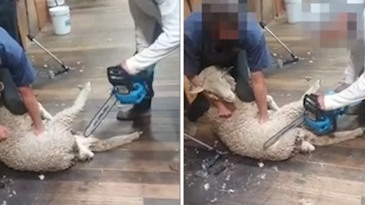 据报道,这段流传在社交媒体脸书上的视频拍摄于塔斯马尼亚州一座农场。视频中的一名男子按住绵羊,而另一个人正用电锯割羊背上的毛。