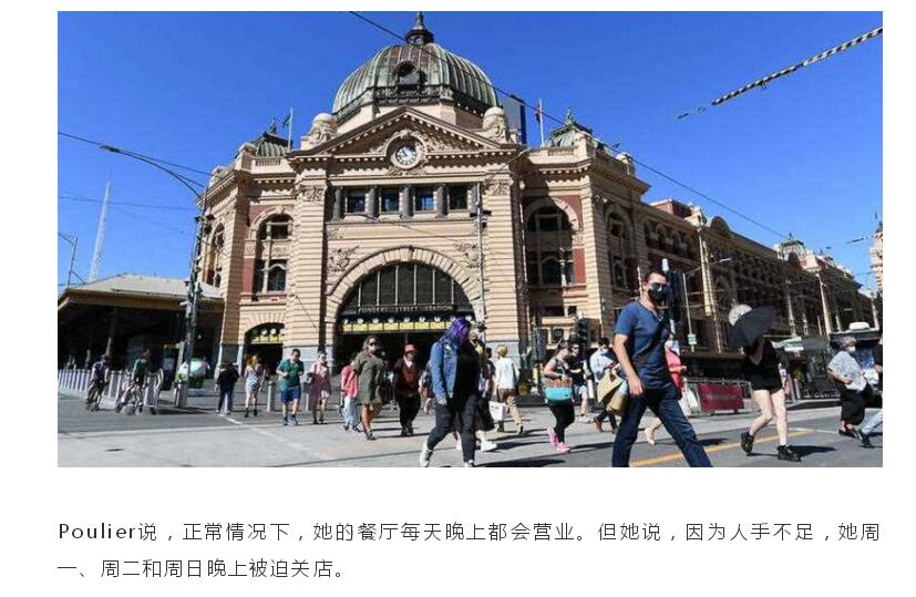 据《TheAge》报道称,随着墨尔本的服务业出现大范围的员工短缺,经营者们被迫削减营业时间,现在想在周日、周一、周二晚上找到可以吃饭的门店已经不像以前那么容易了