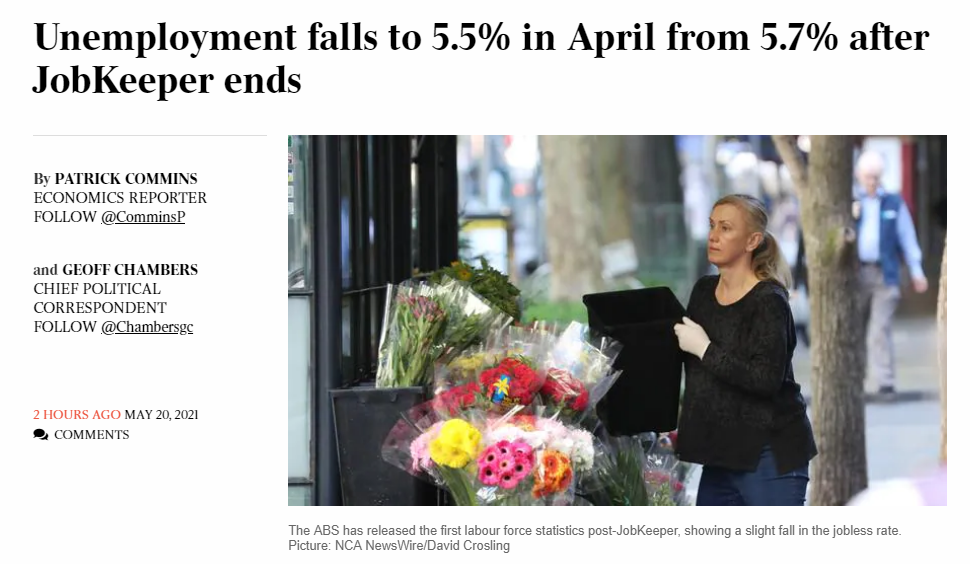 澳洲统计局(ABS)最新数据显示,澳洲4月的失业率降至5.5%。留职补贴(JobKeeper)计划的结束并没有引发失业率的飙升。《澳洲人报》20日报道,自3月结束留职补贴后的首