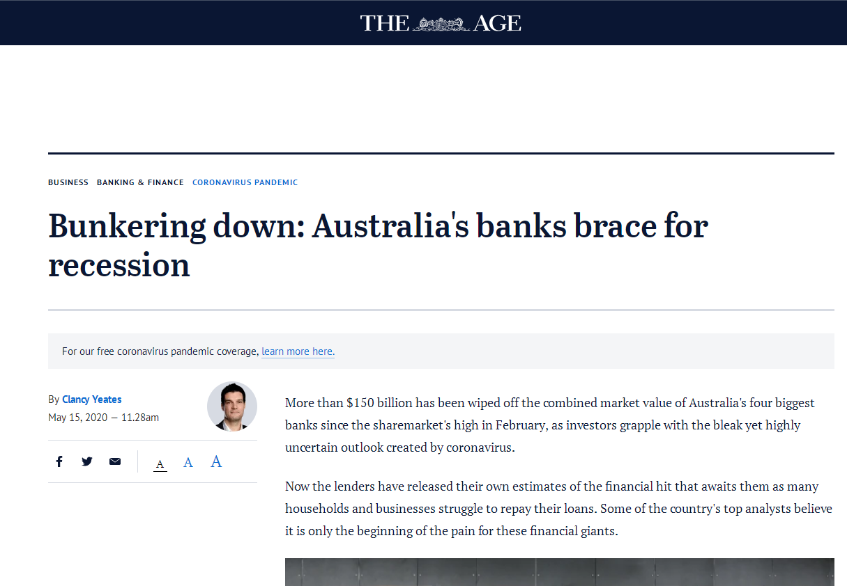 自澳洲股票市场2月创下新高以来,澳洲四大行的市值已经蒸发了超过1500亿元,令投资者面临着在新型冠状病毒疫情的影响下,黑暗却又高度不确定的未来。《时代报》15日
